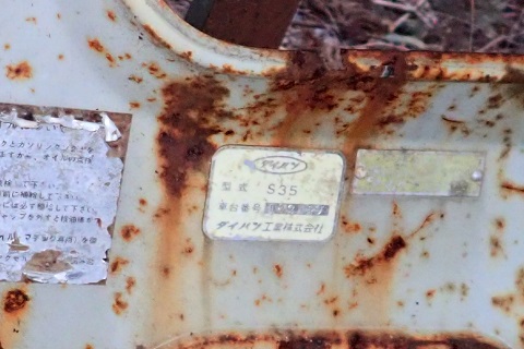 近くには4輪車もあった。ダイハツハイゼットキャブ。コーションプレートによるとS35型。サブロクの軽トラだ。キャビンだけが置かれているように見えるが、台枠も下にある。錆びてキャビンがフレームから外れ、地面に接地している。